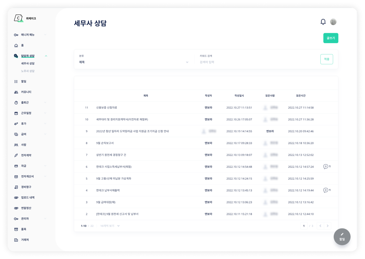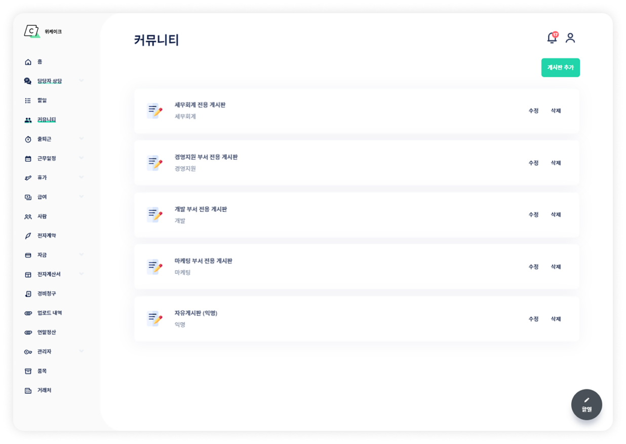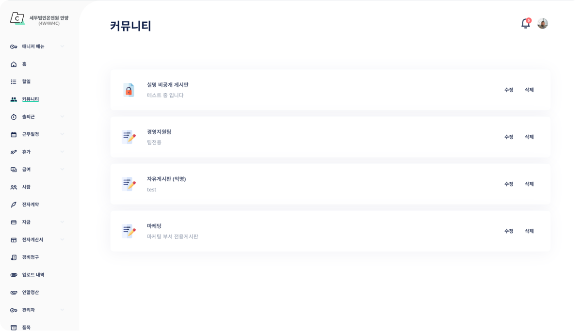 커뮤니티 기능을 통해 업무 공유와 담당자 상담이 가능합니다.