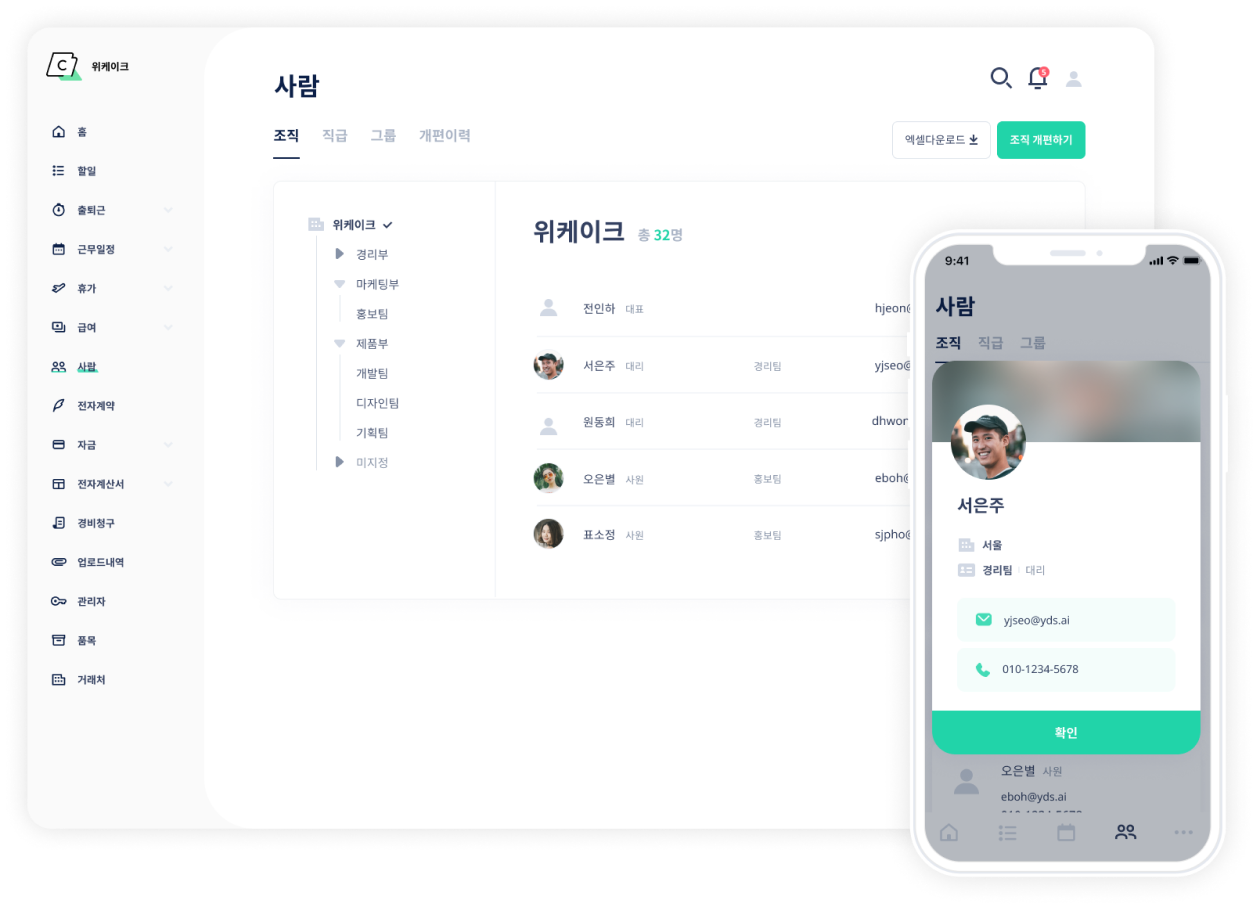 직원별, 부서별, 프로젝트별 인원 현황 및 연락처 확인
