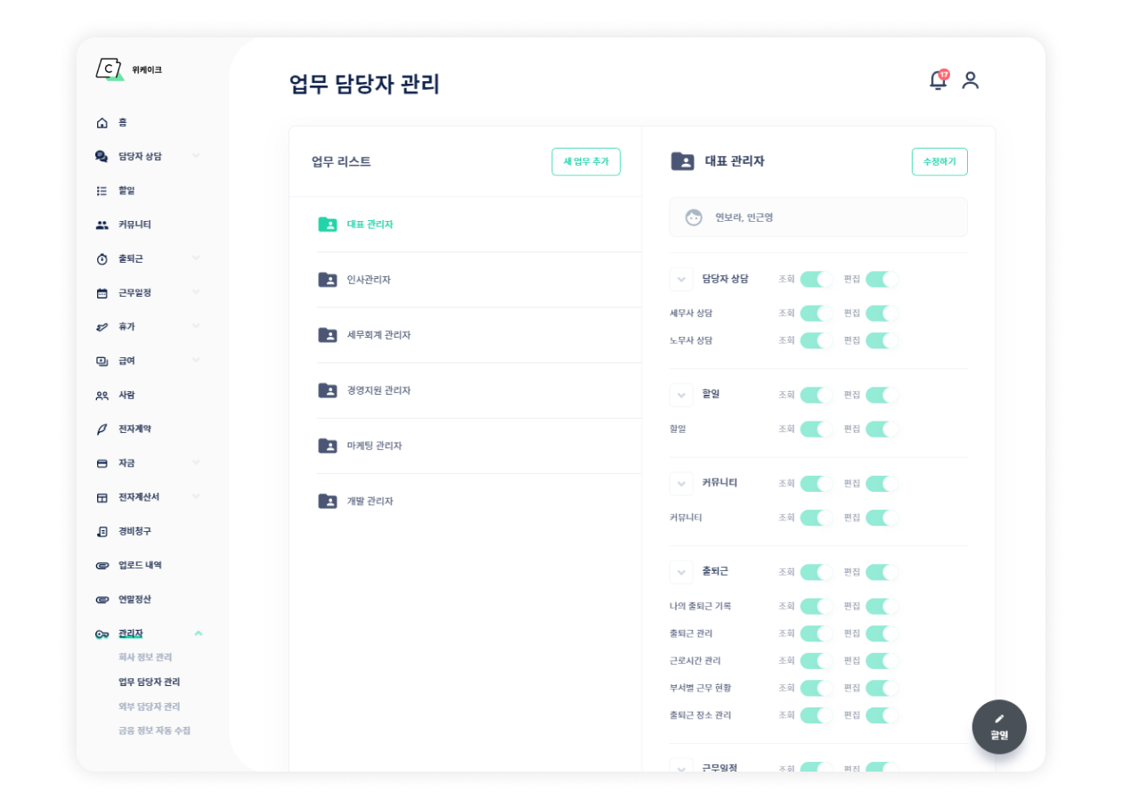 업무담당자를 개별적으로 지정하고 관리자별, 기능별 권한 지정
