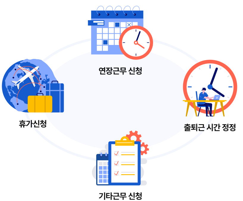 출퇴근 시간 정정, 연장 근무, 휴가 신청 등 반복적인 문서 작성이나 직접 대면의 불편함을 줄일 수 있는 정형화된 업무 포맷으로 시간과 장소에 구애 없이 누구나 편리하게 사용할 수 있습니다.